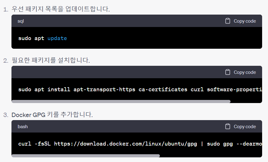 나는 chatGPT한테 docker 설치 코드 알려줘! 라고 물어봤더니 너무 잘 알려줘서 그걸 그대로 실행했다!