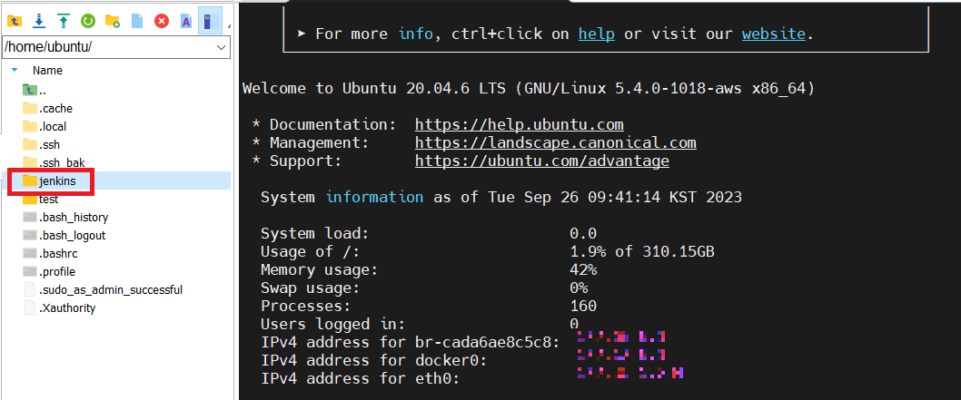그 다음 home/{사용자명} 폴더 아래에 - 나는 ubuntu기 때문에 home/ubuntu 폴더 였다 - jenkins 폴더를 하나 만들어서 그곳에 docker compose 파일을 복사해줬다!