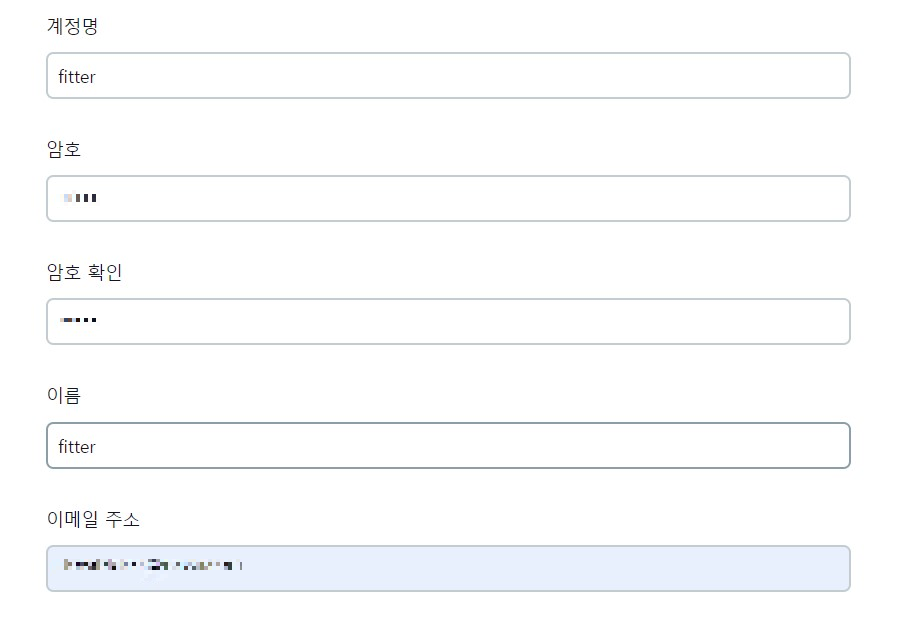 이메일은 뭐 그냥 내거 입력했구... 계정명으로는 우리 프로젝트 이름인 fitter로 했다!