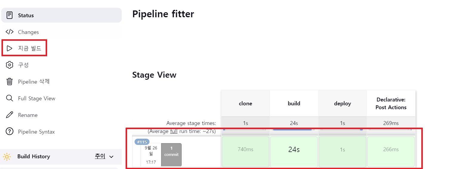 왼쪽의 지금 빌드를 누르면 성공적으로 됨을 알 수 있다!