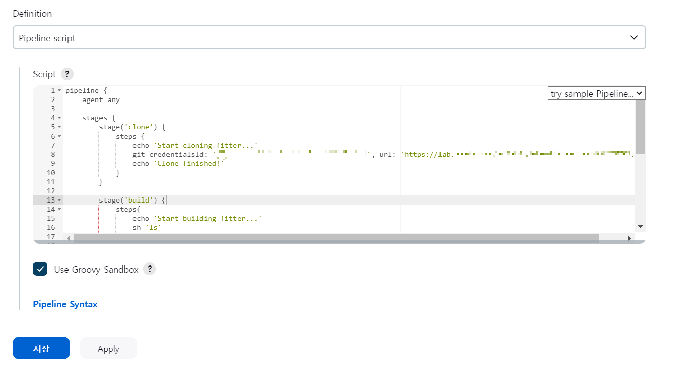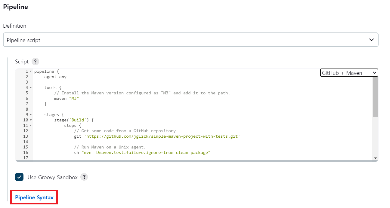 그 전에 왼쪽 하단의 Pipeline Syntax를 클릭한다.