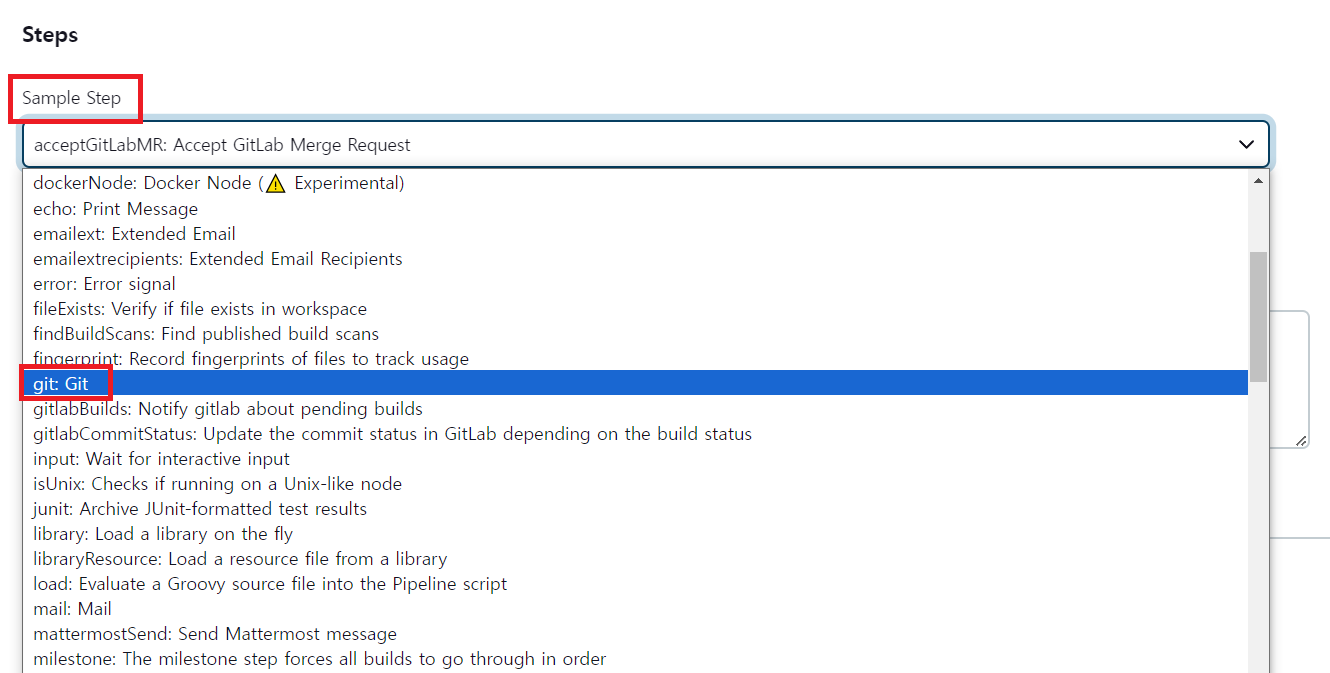 그럼 요로코롬 화면이 나오는데 Sample Step에서 git: Git을 선택한다.