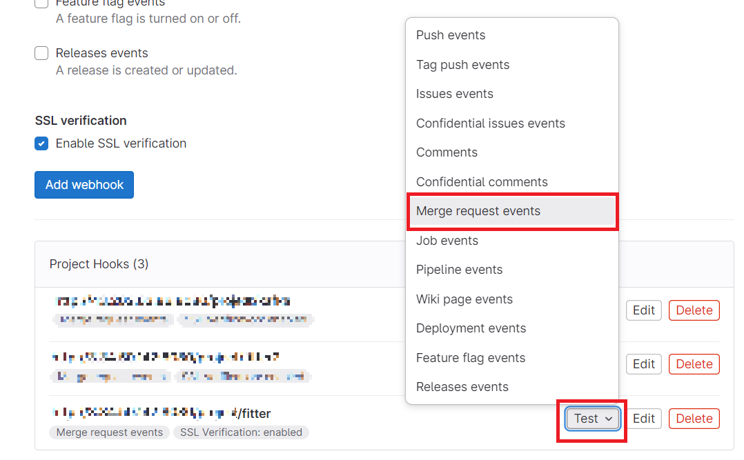 그럼 아래쪽에 webhook들이 있는데 방금 내가 만든 fitter webhook의 Test를 클릭하고 Merge request events를 클릭한다.