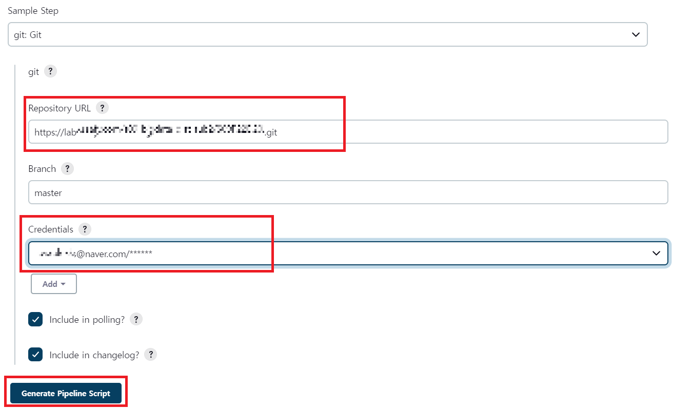 복사한 url을 Repository URL에 붙여넣고, Credentials에 제일 처음 만든 credential을 선택한다. (username w. password 그거)