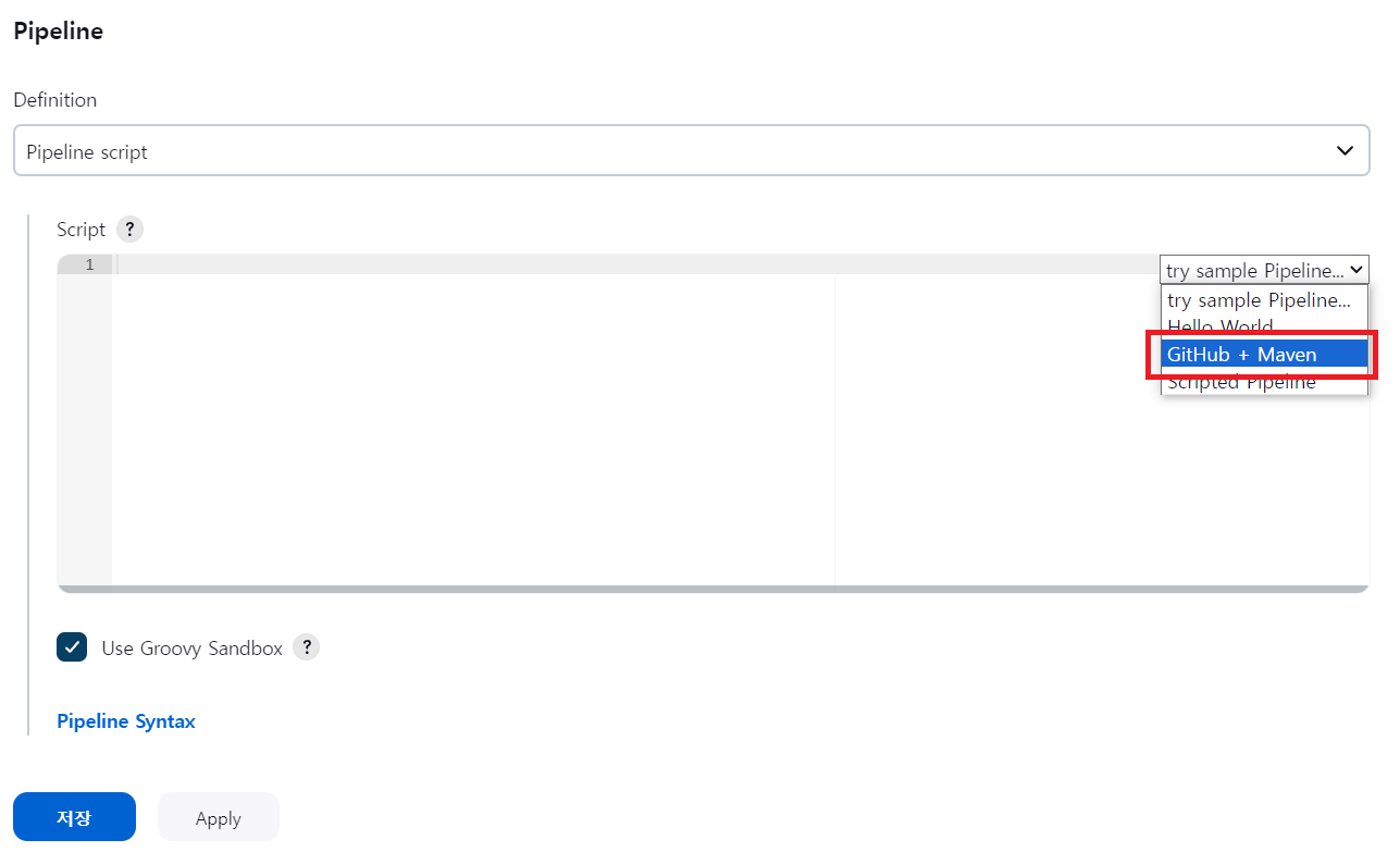 그럼 Script 오른쪽에 select box에서 GitHub + Maven을 선택한다.