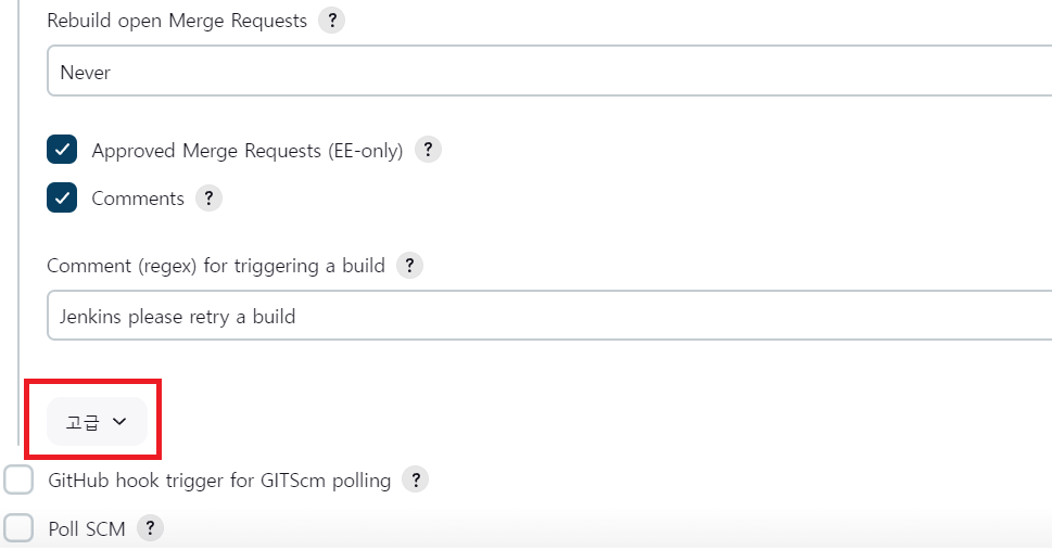 Build when a change is pushed to GitLab을 체크하고, 그 다음 옵션으로 Accepted Merge Request Events에 체크한다.